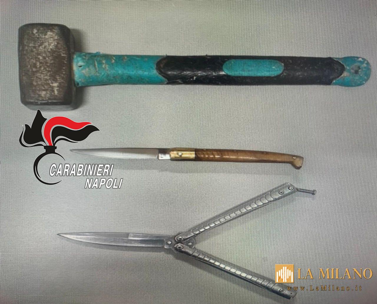 I Carabinieri sono fermi per un posto di controllo lungo le vie cittadine. Nel corso di un controllo, i militari ricostruiscono che il conducente -un 44enne di Napoli- in passato era ritenuto contiguo al clan Ascione-Papale; sua moglie 45enne è già nota, mentre il loro figlio 21enne è incensurato. Perquisiscono sia l’intera famiglia che l’auto a noleggio: nella borsa della donna e nella tasca del ragazzo erano nascosti un coltello “a stiletto” ed uno “a farfalla”; in auto era invece occultato un martello da carpentiere. Il tutto è stato sequestrato. I soggetti coinvolti sono stati denunciati per porto illegale di oggetti atti ad offendere